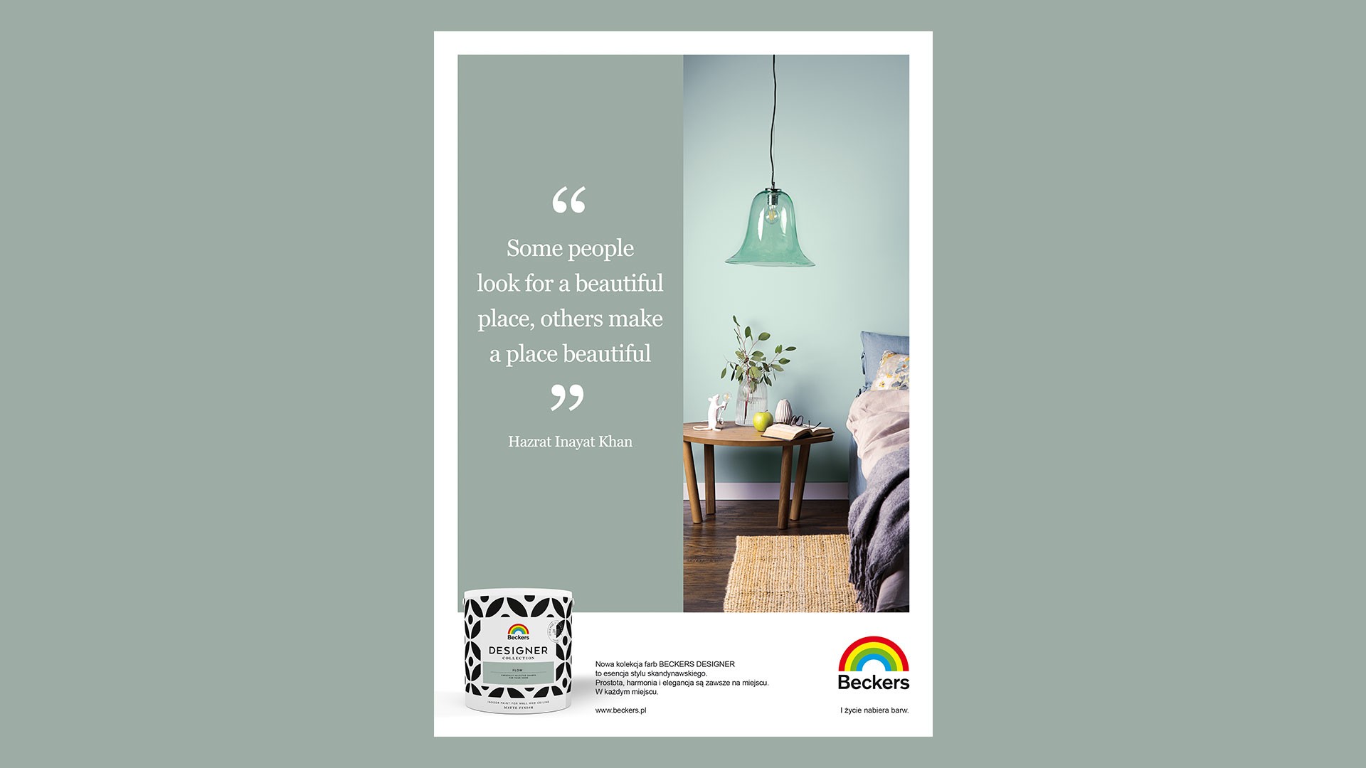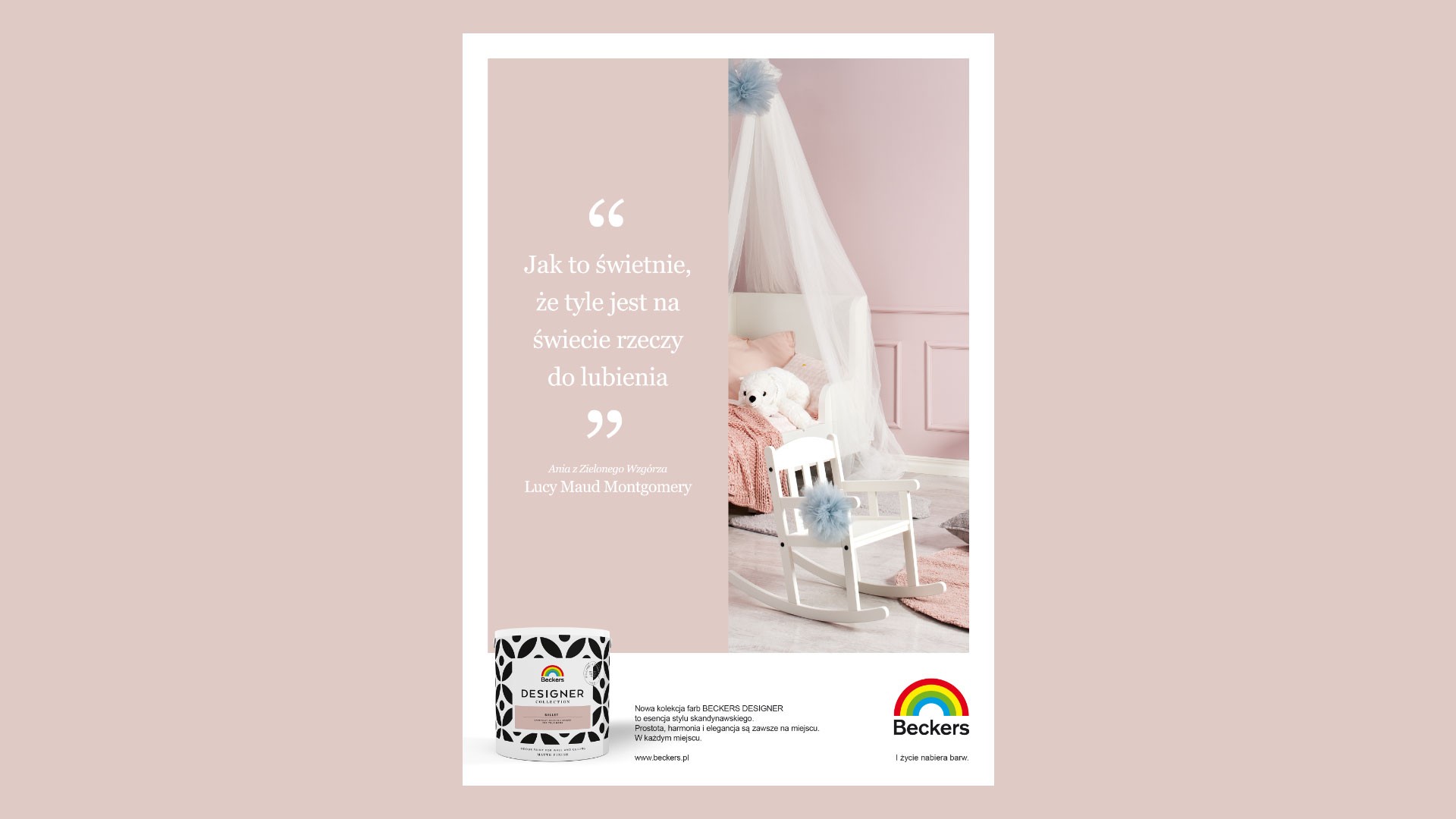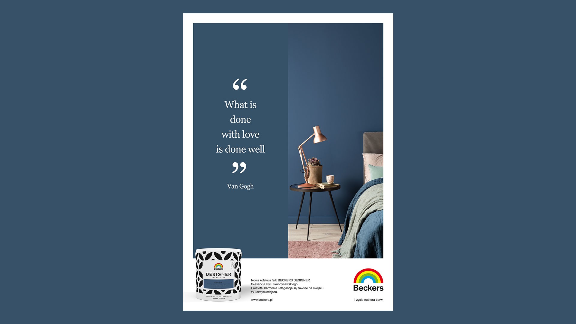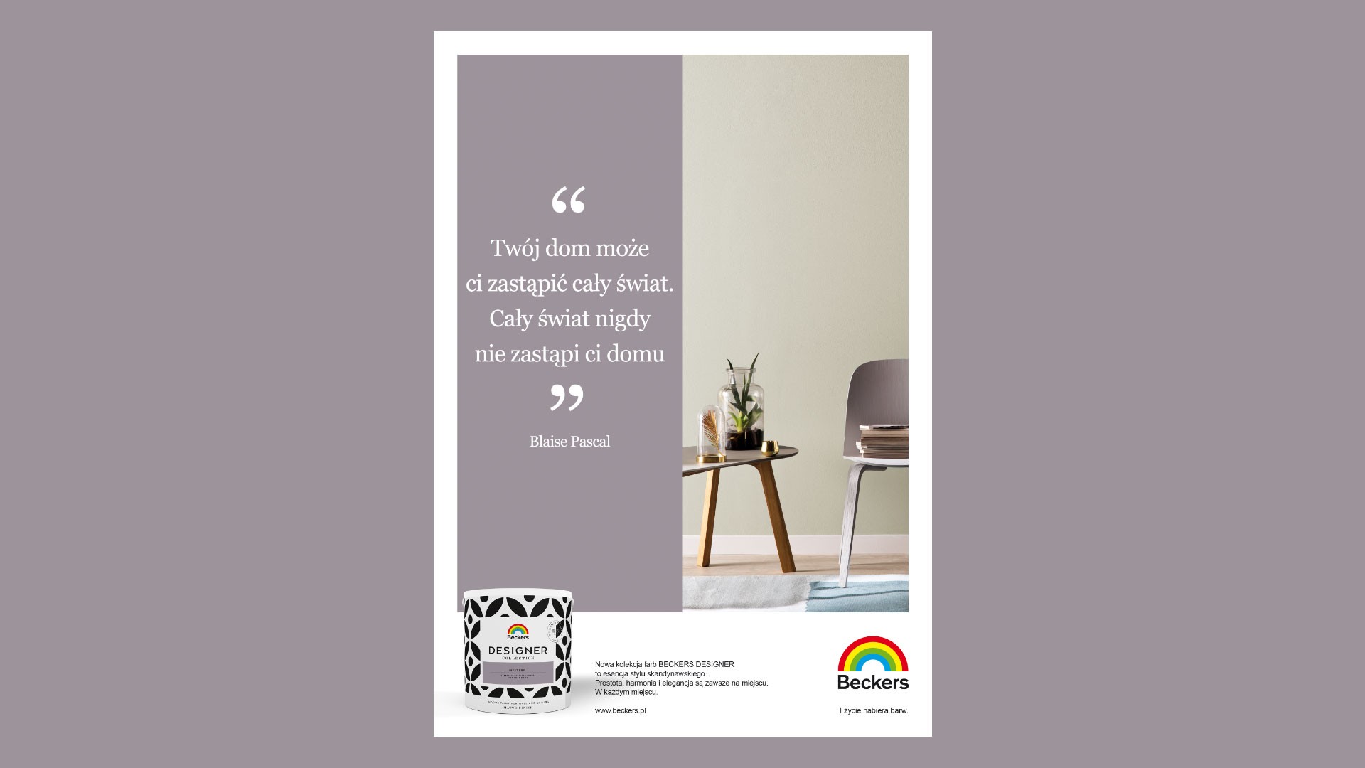 Opracowanie kompleksowej kampanii promocyjnej dla nowej linii farb Beckers Designer Collection. Kolekcja pozycjonowana jako esencja stylu skandynawskiego wymagała spójnego systemu graficznego obejmującego materiały drukowane, broszurę produktową i materiały POS — przy jednoczesnym wzmocnieniu wizerunku Beckers jako lidera w kategorii farb dekoracyjnych.