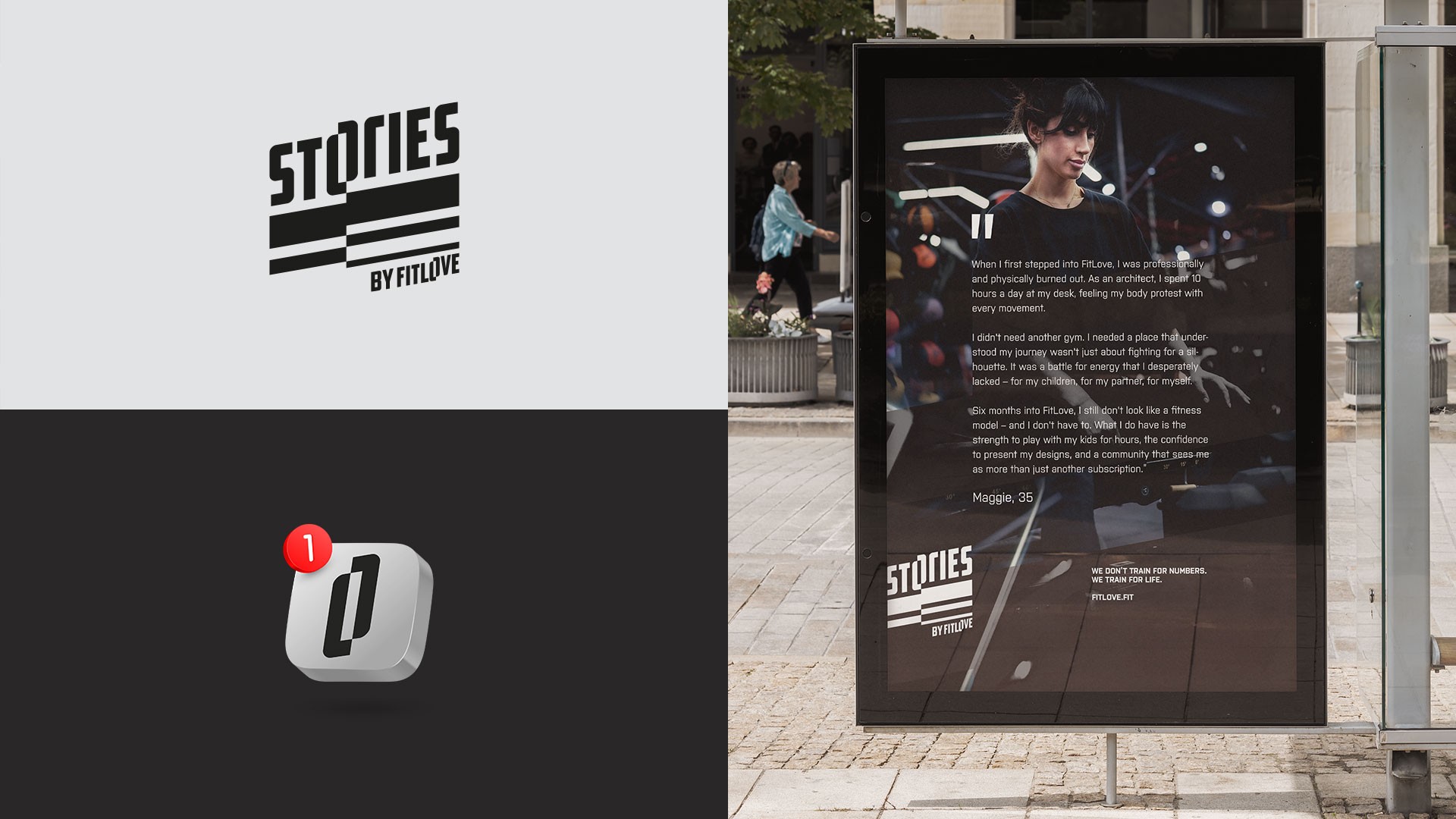 Spójny system identyfikacji wizualnej oparty na geometrycznym logotypie, który skaluje się od haftu na odzieży po oznakowanie budynku. System objął pełne spektrum zastosowań — od materiałów drukowanych i outdooru, przez przestrzeń studia, po komunikację digital z autorskim subsystemem "Stories by FitLove".